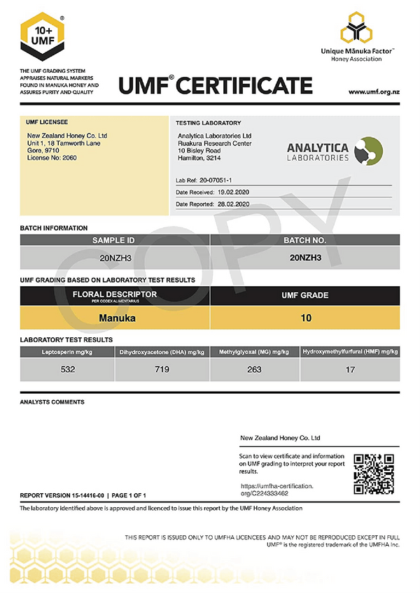 We test the levels of these four natural markers as a guarantee of the UMF™ standard, ensuring the purity and quality of our Manuka Honey. To view the UMF™ certificate specific to your jar of authentic manuka honey, scan the QR code on the lid of the jar with your mobile phone.