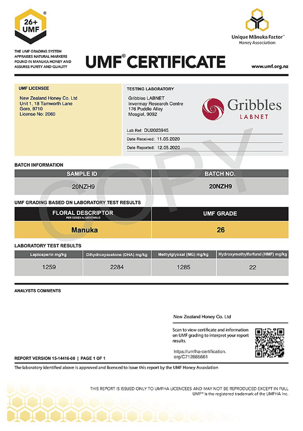 We test the levels of these four natural markers as a guarantee of the UMF™ standard, ensuring the purity and quality of our Manuka Honey. To view the UMF™ certificate specific to your jar of authentic manuka honey, scan the QR code on the lid of the jar with your mobile phone.